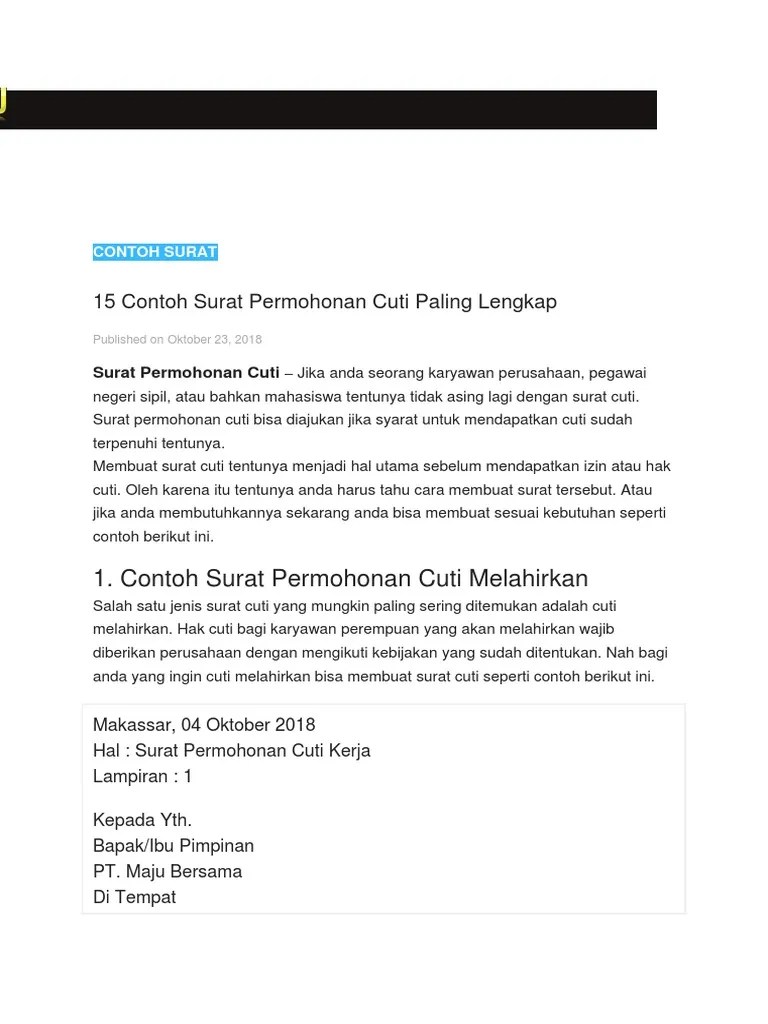 Biasanya, nih, banyak karyawan memanfaatkan hari libur nasional untuk mengambil cuti. Surat cuti merupakan surat yang dibuat sebagai bentuk pemberitahuan atau permohonan izin ke perusahaan . Surat cuti merupakan surat yang dibuat sebagai bentuk permohonan izin ke pihak perusahaan bahwa seorang karyawan . Setiap perusahaan memiliki prosedur pengajuan cuti yang .